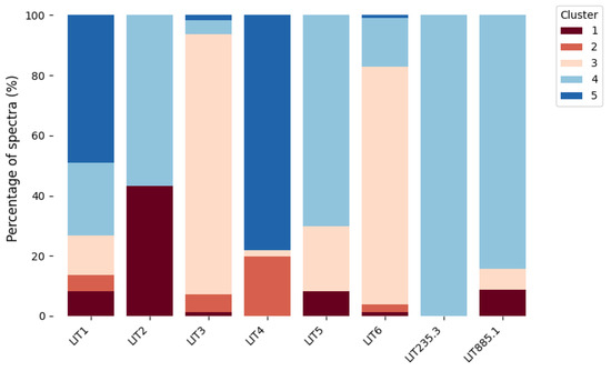 Figure 9 shows the percentage distribution of spectra from each sample across these five clusters. This figure visually illustrates the spectral composition of each shell sample based on the proportion of its individual Raman spectra assigned to each cluster. The two archaeological samples show the dominance of Cluster 4. LIT235.3 shows an almost exclusive assignment to Cluster 4 (100%), while LIT885.1 also consists mainly of this cluster (85%), with minor contributions from other clusters (Cluster 1 and Cluster 3).