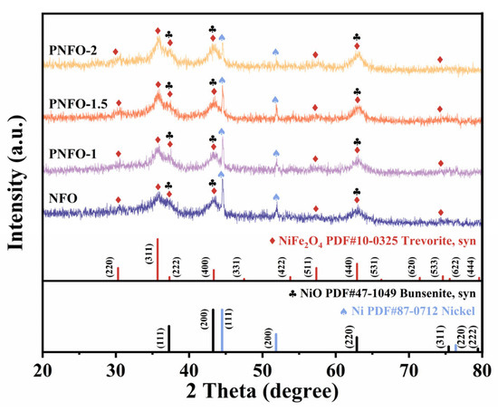 XRD spectra of nickel ferrite and nickel ferrite samples with different Pt concentrations were analyzed to explore the crystalline structure of the sensing material. As depicted in Figure 2, all samples showed characteristic diffraction peaks of NiFe2O4 (PDF#10-0325), confirming the formation of NiFe2O4. In addition, peaks for NiO (PDF#47-1049) and Ni monomer (PDF#87-0712) were also identified. The characteristic peaks of NiFe2O4 are still dominant in the XRD spectra of PNFO-1, PNFO-1.5, and PNFO-2, indicating that the introduction of Pt did not damage the crystal structure of NiFe2O4. In addition, no characteristic peaks of Pt were detected, potentially attributable to the low Pt content and the limited detection precision of the XRD equipment. The simultaneous appearance of peaks of NiO and Ni in all samples is attributed to the 1:1 molar ratio between Ni and Fe during synthesis, and the excess source of Ni generated NiO after the generation of NiFe2O4, while some Ni ions were reduced to Ni metal by the reduction in EG during the synthesis.