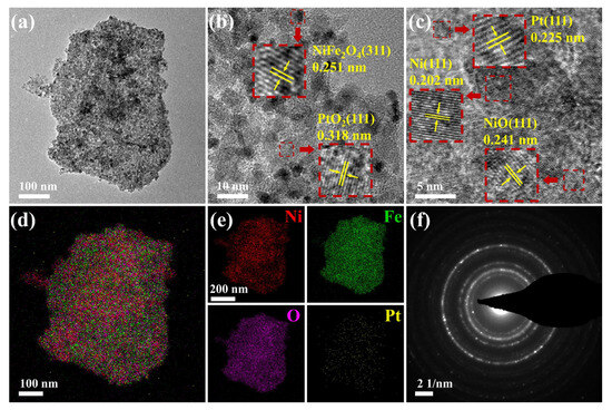The microstructure and elemental composition of the PNFO-1.5 sample are depicted in detail in Figure 4. The low-magnification TEM image (Figure 4a) reveals that the nanosheets composing the sample are composed of many nanoparticles and have a porous structure. The lattice spacing of 0.251 and 0.318 nm observed in Figure 4b correspond to the (311) crystal plane of NiFe2O4 and the (111) crystal plane of PtO2, respectively [5,42]. The lattice spacing of 0.202 nm and 0.241 nm in Figure 4c correspond to the (111) crystallographic plane of Ni and NiO, respectively, indicating that Ni and NiO present simultaneously within the sample [26]. In addition, the Pt (111) crystallographic plane was observed (lattice spacing of 0.225 nm) [43]. The elemental distribution images of the nanosheets (Figure 4d,e) reveal a homogeneous distribution of Ni, Fe, O, and Pt without obvious agglomeration, indicating that Pt is well dispersed in the samples. This uniform dispersion promotes an increase in active sites within the sensing material and aids in enhancing its gas-sensing performance. And the surface atomic ratios obtained through energy dispersive spectroscopy (EDS) analysis are shown in Table S2. In addition, the selected area electron diffraction (SAED) pattern (Figure 4f) shows typical polycrystalline rings, indicating that the sample has a polycrystalline structure and good crystallinity.