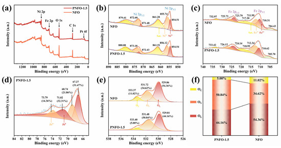 (a) XPS survey spectra of the NFO and PNFO-1.5 samples; High-resolution spectra of (b) Ni 2p, (c) Fe 2p, (d) Pt 4f, and (e) O 1 s; (f) The percentage of the different oxygen species of NFO and PNFO-1.5.