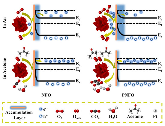 As is widely recognized, the sensing mechanism of metal-oxide-semiconductor gas sensors relies on the adsorption and desorption of gas molecules at the surface of the sensing material, along with the surface resistance variation resulting from the redox reaction of test gas molecules on the material surface, as depicted in Figure 8. When the sensor is exposed to air, dissociative adsorption of oxygen molecules occurs at the surface of the sensing material, accompanied by electron transfer from the material’s conduction band to form surface chemisorbed oxygen ions (Equations (2)–(4)) [38,71,72,73,74,75]. In the p-type semiconductor sensing material, with holes serving as the majority carriers, exposure to air depletes conduction band electrons and induces the formation of a hole accumulation layer at the surface [76,77]. When the sensor is exposed to acetone gas, surface-adsorbed oxygen ions on the sensing material undergo a redox reaction with acetone gas molecules, Equation (5). During this process, electrons revert to the conduction band of the sensing material, which attenuates the surface hole accumulation layer and correspondingly elevates sensor resistance under reducing gas exposure.