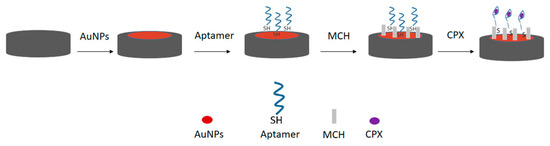 Before aptamer immobilization, the working electrode was modified with gold nanoparticles (AuNPs) to facilitate thiol–gold binding and enhance the electrochemical surface area. For this, 10 μL of the freshly prepared AuNP dispersion was deposited onto the working electrode surface by the drop-casting method and subsequently dried in a laboratory oven at 50 °C for 20 min to ensure adequate solvent evaporation and nanoparticle adhesion. Next, 10 μL of a 3 μmol L−1 aptamer sequence solution was added to the electrode and incubated for 30 min at room temperature. After this period, 4 μL of a 1 mmol L−1 MCH solution was added to the electrode for 30 min to fill the unoccupied spaces between the aptamer sequences, as shown in Figure 1.