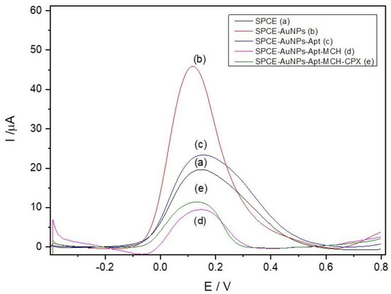 Differential pulse voltammograms at different electrode modification stages in 0.10 mol L−1 phosphate buffer (pH 7.00) containing 5.0 mmol L−1 K4[Fe(CN)6]: (a) SPCE; (b) SPCE-AuNPs; (c) SPCE-AuNPs-Apt; (d) SPCE-AuNPs-Apt-MCH; (e) SPCE-CB-AuNPs-Apt-MCH-CPX.