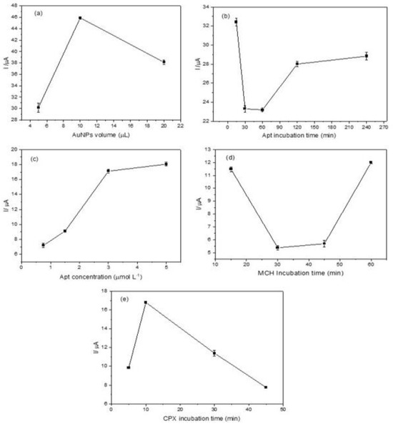 Optimization of the electrochemical aptasensor: (a) anodic peak current variation as a function of the AuNP volume applied to the electrode; (b) effect of aptamer incubation time on the anodic peak current; (c) influence of aptamer concentration on the anodic peak current in the presence of CPX (50 nmol L−1); (d) impact of MCH incubation time on the anodic peak current; (e) anodic peak current variation with CPX (50 nmol L−1) incubation time. Measurements were performed in 0.1 mol L−1 phosphate buffer solution (pH 7.00) containing 5.0 mmol L−1 K4 [Fe (CN)6].