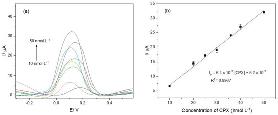 (a) Differential pulse voltammograms recorded for CPX at concentrations of 10, 20, 25, 30, 36, 40, and 50 nmol L−1; (b) analytical curve constructed from the voltammograms shown in Figure 5a. The electrochemical measurements were performed in 0.1 mol L−1 phosphate buffer solution (pH 7.00) containing 5.0 mmol L−1 K4[Fe(CN)6].