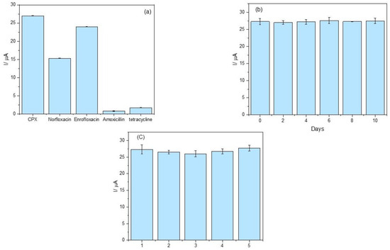The selectivity study compared structurally related compounds at the same concentration while evaluating structurally different antibiotics at higher concentrations to simulate real-sample conditions better and assess potential cross-reactivity. As shown in Figure 6a, the peak current variation was less than 6% in the presence of tetracycline and amoxicillin, indicating negligible interference from these compounds. These results demonstrate that the proposed aptasensor exhibits high selectivity for CPX detection in the presence of these potential interferents.