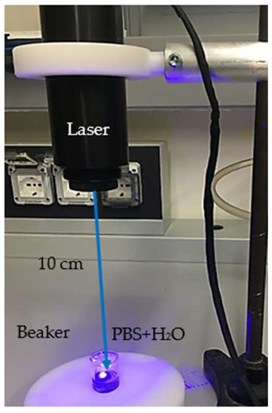 A semiconductor laser system, later denominated ‘blue laser’, operating at a wavelength of 450 nm was used in continuous wave (CW) mode, at an output power of 50 W, and intensity of 5 × 103 W/cm2, and with a beam size of about 1 mm × 5 mm. A phosphate-buffered saline (PBS) tablet, having a weight of 2 g, purchased from Sigma Aldrich (Milan, Italy), was dissolved in 200 mL of deionized water [31]. A piece of charcoal in a rectangular shape of 1.1 cm2 surface and 0.15 cm thickness was used as the primary target. It was located in a glass vessel containing 4 mL of PBS at a controlled pH of 7. Figure 1 shows the setup employed for the CDs’ preparation [32].