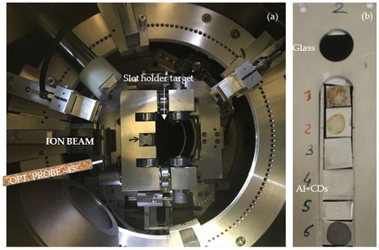 Figure 3 displays the vacuum chamber at line A, and it reports the incoming proton ions at a 0° incident angle in the center of the slot where the sample holders are located.