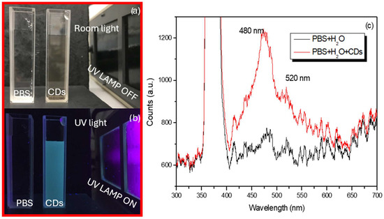 Assuming a spherical shape for the produced CDs with a size of about 10 nm in diameter, and three hours of laser irradiation of the charcoal immersed in PBS, the number of nanoparticles/cm3 produced should be of the order of 4.7 × 1015. Figure 4 shows quartz cuvettes containing the pristine PBS and CDs suspensions illuminated by room light (see Figure 4a) and then by UV light (see Figure 4b). Under UV exposition, the cuvette containing the CDs is luminescent while the cuvette containing only PBS is merely visible. Figure 4c shows the luminescence spectrum revealed when both the cuvettes without and with CDs are illuminated by UV light at 365 nm. The excitation peaks are visible at 480 nm and 520 nm in both cases. However, the presence of CDs significantly amplifies the luminescence at 480 nm as mentioned in ref. [37].