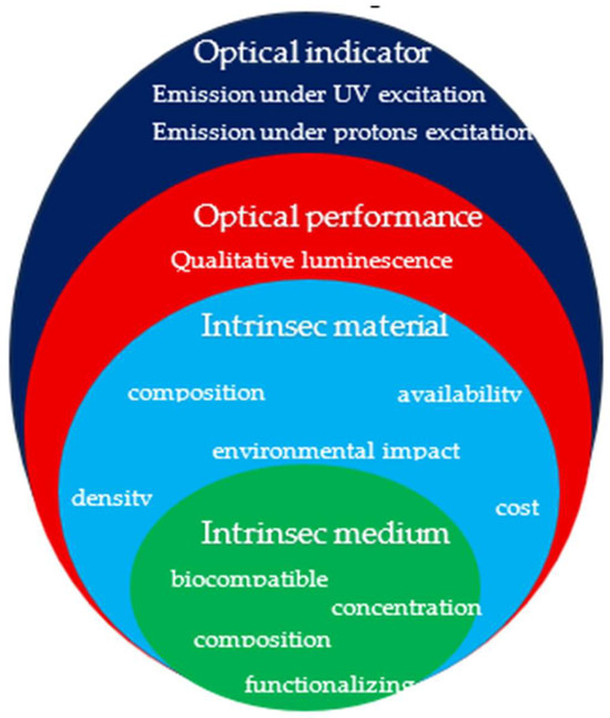 To design and compare the performance of the CDs produced by laser ablation, the Key Performance Indicators (KPIs) have been included (see Figure 6). KPIs are classified into four main groups: (1) intrinsic medium properties related to composition and concentration of components with respect the solvent (water) content; (2) intrinsic material properties related to composition, density, and porosity of the charcoal used as primary material for the production of CDs by laser ablation; (3) optical performance of the CDs suspension related to qualitative luminescence under excitation of UV light, (4) optical indicators related to the behavior and yield under excitation of UV light and proton ions at two different energies.