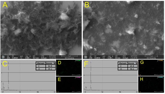 SEM images of (A) rGO and (B) rGO/β-CD composite; (C) EDS spectrum of rGO; (D,E) EDS mapping of rGO; (F) EDS spectrum of rGO/β-CD; (G,H) EDS mapping of rGO/β-CD.