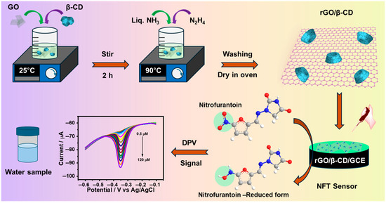 Schematic illustration of the synthesis of the rGO/β-CD nanocomposite and its application in the electrochemical detection of NFT.