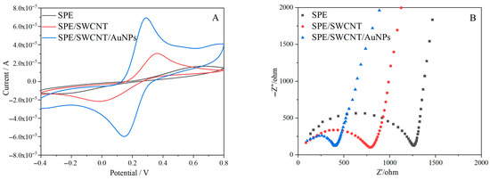(A) CV of SPE, SPE/SWCNTs, and SPE/SWCNTs/AuNPs at a scanning rate of 100 mV/s under the conditions of 5.0 mM [Fe(CN)6]4−/3− and 0.1 M KCl. (B) EIS of SPE, SPE/SWCNTs, and SPE/SWCNTs/AuNPs in 5.0 mM [Fe(CN)6]4−/3− and 0.1 M KCl solutions at 100 kHz–0.1 Hz (potential = 0.2 V).