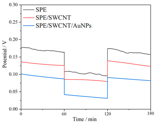 Water layer testing of SPE/Ca-ISM, SPE/SWCNTs/Ca-ISM, and SPE/SWCNTs/AuNPs/Ca-ISM electrodes. The electrode potentials were measured successively at 10−2 M CaCl2, 10−2 M NaCl, and 10−2 M CaCl2 for 60 min.