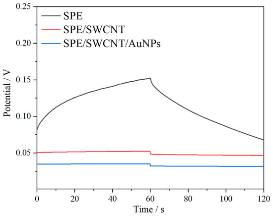 Chronopotentiometry was employed to assess the capacitance of the solid contact layer and the short-term potential stability of the ISEs [47]. Figure 6 presents the chronopotentiograms of SPE/Ca-ISM, SPE/SWCNTs/Ca-ISM, and SPE/SWCNTs/AuNPs/Ca-ISM. A constant current of ±1 nA was applied to the electrode for 60 s while the resulting potential changes were observed. The short-term potential stability was evaluated using the formula ΔE/Δt = I/C, where I represents the applied current (±1 nA), Δt is the current application time (60 s), and C is the capacitance [48]. The calculated potential drift for SPE/Ca-ISM was 1400 μV/s, corresponding to a capacitance of 0.7 μF. In contrast, SPE/SWCNTs/Ca-ISM and SPE/SWCNTs/AuNPs/Ca-ISM exhibited significantly reduced potential drifts of 32.3 and 9.1 μV/s, respectively, with capacitances of 31.3 and 109.9 μF. These findings demonstrate that the utilization of SWCNTs/AuNPs as solid contact layers substantially enhances the short-term potential stability and capacitance of the Ca2+-ISE, thereby facilitating the fabrication of reliable solid-contact ISE.