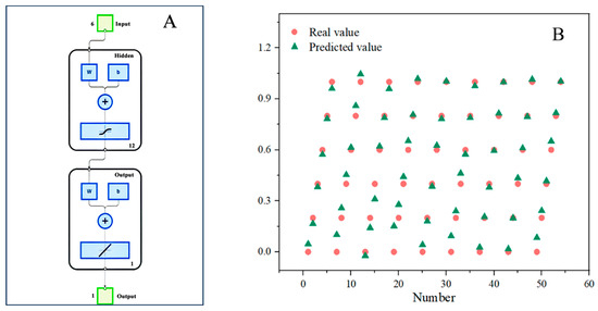 (A) the structure of the artificial neural network and (B) the calculated real and predicted values.