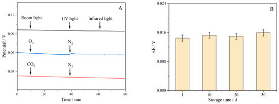 O2, CO2, and light are the main factors affecting the stability of SC-ISEs [8]. O2 and CO2 can diffuse into the ISM, reacting with redox-active substances or water, which alters the local pH within the ISM and impacts electrode stability [52]. Furthermore, solid contact layers with photosensitive properties are also susceptible to interference from ambient light. The anti-interference ability of the electrode can be evaluated by recording its potential in 10−2 M CaCl2. Prior to testing, the electrode was equilibrated in the solution for 10 min. To evaluate the effects of O2 and CO2, these gases were introduced into the solution for 30 min each, followed by a 30 min purging with N2. As depicted in Figure 10, no significant potential interference was observed, suggesting that O2 and CO2 have a negligible impact on the electrode’s stability. This may be attributed to the absence of a water layer between the Ca-ISM and conversion layer, preventing CO2 from reacting with water to form carbonic acid and thus avoiding pH changes. Additionally, the absence of redox-active substances in the conversion layer precludes reactions with O2, further minimizing potential interference [53]. To evaluate photosensitivity, the electrodes were exposed to room light, ultraviolet light, and infrared light individually. The results presented in Figure 10A indicate that SPE/SWCNTs/AuNPs/Ca-ISM is not susceptible to light-induced interference. These findings collectively demonstrate the robust potential stability of the sensor, attributable to the unique properties of the SWCNTs/AuNP-based ion–electron conversion layer. In addition, the potential change of the sensor within 30 days is very small, demonstrating satisfactory stability (Figure 10B).