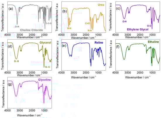 Infrared spectra of the precursors: (a) choline chloride, (b) urea, (c) ethylene glycol and (d) glycerol, and of the prepared DESs: (e) reline, (f) ethaline and (g) glyceline.