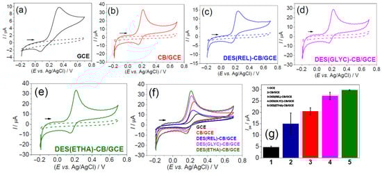 Cyclic voltammograms obtained in 0.1 mol L−1 phosphate buffer solution (pH = 7.0) in the absence (dotted lines) and presence (full lines) of 5.0 × 10−4 mol L−1 DA using different electrodes: (a) GCE, (b) CB/GCE, (c) DES(REL)-CB/GCE, (d) DES(GLYC)-CB/GCE and (e) DES(ETHA)-CB/GCE. (f) Comparison of the cyclic voltammograms recorded for the 5.0 × 10−4 mol L−1 DA using the different studied electrodes. (g) Bar graph with peak current values recorded using the five tested electrodes.