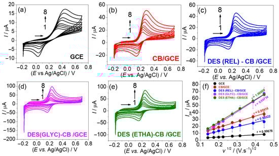 Cyclic voltammograms obtained at different scan rates (1–20 mV s−1 to 8–200 mV s−1) in 0.1 mol L−1 phosphate buffer solution (pH = 7.0) in the presence of 5.0 × 10−4 mol L−1 DA using different electrodes: (a) GCE, (b) CB/GCE, (c) DES(REL)-CB/GCE, (d) DES(GLYC)-CB/GCE and (e) DES(ETHA)-CB/GCE. (f) Plots of Ipa vs. v1/2 recorded for bare GCE (●), CB/GCE (●), DES(REL)-CB/GCE (●), DES(GLYC)-CB/GCE (●) and DES(ETHA)-CB/GCE (●).