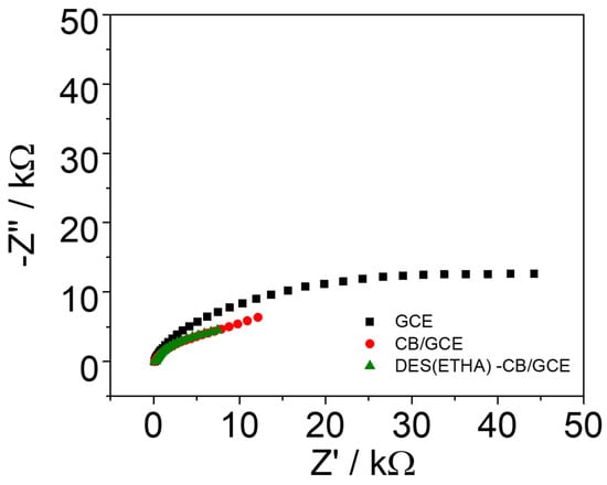 Figure 6 displays the Nyquist diagrams recorded using the bare and modified GCEs. From the diameter of the semicircles obtained in the low-frequency region, the values of the charge transfer resistance (Rct) were predicted, these being equal to 50.76 kΩ (GCE), 15.59 kΩ (CB/GCE) and 12.72 kΩ (DES (ETHA)-CB/GCE). Thus, the electrode modified with CB and DES presented a lower charge transfer resistance, corroborating the CV results.