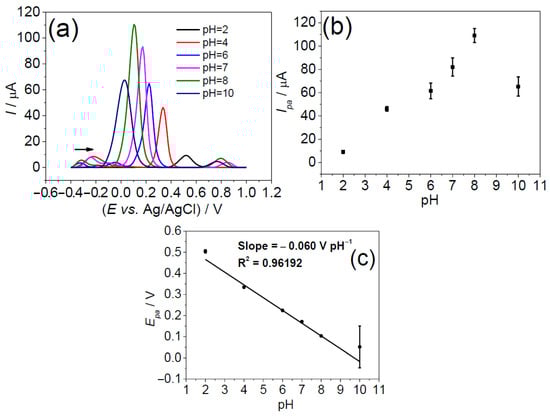 (a) Differential pulse voltammograms obtained in 0.1 mol L−1 phosphate buffer solution at different pHs containing 5.0 × 10−4 mol L−1 DA using DES(ETHA)-CB/GCE. DPV parameters: a = 50 mV, tm = 5 ms and v = 20 mV s−1. Plots of (b) Ipa vs. pH and (c) Epa vs. pH.