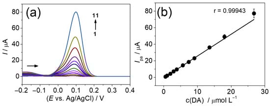 (a) Differential pulse voltammograms obtained in 0.1 mol L−1 phosphate buffer solution (pH = 8.0) containing different DA concentrations (1: 0.498 µmol L−1 to 11: 26.8 µmol L−1) using the DES(ETHA)-CB-GCE sensor. DPV parameters: a = 80 mV, tm = 20 ms and v = 10 mV s−1. (b) Analytical curve recorded for DA (plot of Ipa vs. c(DA)).