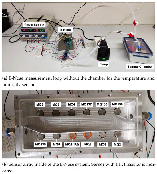 The collected data was retrieved using an SD-Card module. The system setup is depicted in Figure 1a. An external power unit (Komerci QJ3005EIII, Ebern, Germany) was implemented to supply the sensors’ heating elements. The E-Nose system includes three chambers connected by tubes. Polytetrafluoroethylene (PTFE) tubes and a metal chamber were employed to avoid odor attachment. Further, the system was built airtight to avoid sample leakage or contamination. Airflow was produced using a pump (N 811 KN.18, KNF, Freiburg i.B., Germany) with a fixed flow rate of 11.5 L/min. Two three-way valves and one two-way valve were utilized to direct the airflow during the measurement phases. Inside the E-Nose (Figure 1b), the 12 gas sensors were placed in two rows with even spacing. Eleven of the twelve sensors contained a resistor of 10 kΩ. In Figure 1b, the sensor with a 1 kΩ resistor is indicated. The airflow inside the E-Nose was directed in an S-shape using aluminum deflector plates to ensure the sample air passed each sensor. The sample chamber and the temperature and humidity sensor chamber were made of 2 L stainless steel boxes. Temperature and humidity inside the E-Nose were monitored using an independent Arduino (Arduino Nano, Monza, Italy) connected to a DHT22 temperature humidity sensor (ASAIR DHT 22/AM2302, Guangzhou, China).