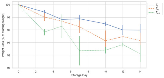 In addition to temperature effects, physical damage also plays a critical role. Mechanically damaged tomatoes (Trtd) exhibited even greater weight loss over the storage period. This trend can be explained by mechanical damage compromising the tomato’s natural protective barrier, leading to increased surface permeability and accelerated transpiration.