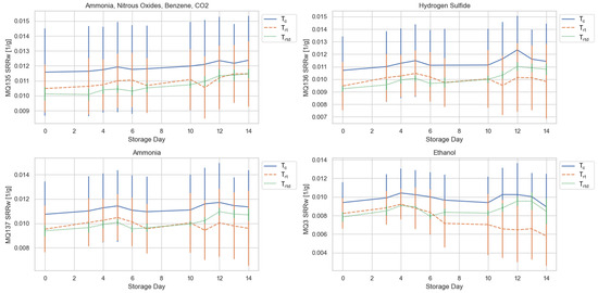 SRRw mean values including standard deviations of the continuously measured tomatoes over time for the different storage scenarios. Sensors: MQ135 (upper left); MQ136 (upper right); MQ137 (lower left); MQ3 (lower right). Tc: cooled temperature; Trt: room temperature; Trtd: room temperature damaged.