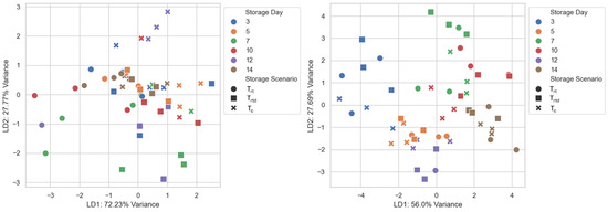 The first and second linear discriminants calculated from the combined dataset plotted against each other. The (left plot) uses the storage scenario as the target variable, while the (right plot) is based on storage day. Data points are color-coded by storage day, and different symbols indicate the respective storage scenarios to illustrate their distribution across the discriminant space. Tc: cooled temperature; Trt: room temperature; Trtd: room temperature damaged.