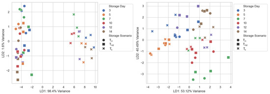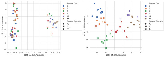 In Figure 6, the LDA performed on the SWC dataset is displayed. The evaluation of the class separation revealed that LD1 could distinguish the storage scenarios Tc from Trt and Trtd, while LD2 could separate all three scenarios. Storage days also differed significantly, except between storage days 7 and 10 as well as 12 and 14. Using the SWC dataset, a visual grouping of the storage days within each storage scenario (Figure 6 (left)) becomes more evident. While some overlap remains during the initial days, clearer separation between the days can be observed toward the end of the storage period across all three scenarios. In contrast, when using storage day as the target variable (Figure 6 (right)), the LDA only partially reveals separable groupings of the storage scenarios within each day.