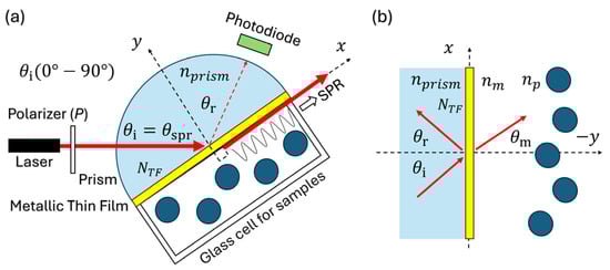 In physics, chemistry, and biology, surface plasmon resonance (SPR), and coherent scattering theory (CST) have gained significant importance in the research of diverse topics, including the study of colloids and suspensions (fluids containing nanoparticles and microparticles, respectively), as they allow us to understand the iterations of light with samples [3,4,23,35,36]. Figure 1 shows a sensor with a coherent light source, a polarizer (), a photodiode, a semicircular prism, a metallic thin film (TF), and particles in a dielectric medium to illustrate the phenomena of SPR and coherent scattering. The refractive indices of the prism (), thin film (), the medium (), and the particles () are indicated. The angle of incidence of the laser beam on the semicircular prism is . The angle in the medium is and is calculated by Snell’s law with the resonance angle () at the interfaces (semicircular prism—thin gold film—glass cell with distilled water), which is . The specular direction is = and is the forward direction.