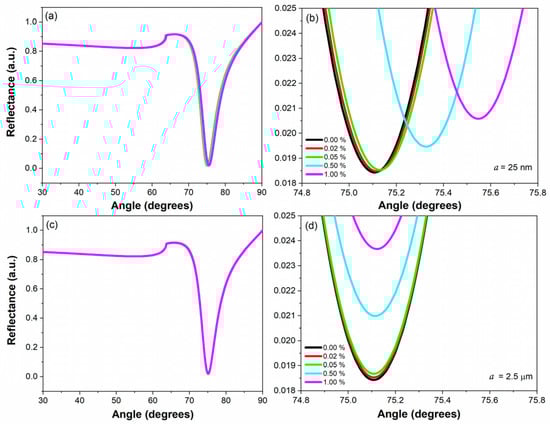 Simulation of reflectance for a solution containing SPSP of 25 nm (a,b) and 2.5 µm (c,d) radius, with concentrations of 0.00, 0.02, 0.05, 0.50, and 1.00% in distilled water. The prism is an FK5, which has a thin film of gold (51 nm in thickness) and a cell for the sample of colloid or solution.