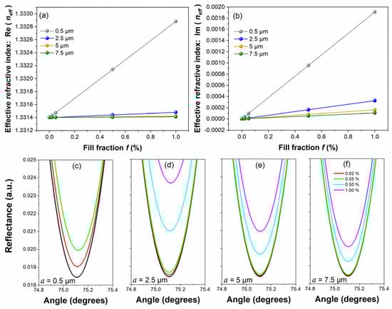 Figure 3a,b shows the real and imaginary parts of the effective refractive index for different solutions with spherical particles of 0.5 µm, 2.5 µm, 5 µm, and 7.5 µm radius in distilled water, with concentrations of 0–1%. Figure 3c–f show the respective reflectances, where the reflectance depth values for spherical particles with a radius of 7.5 µm (Figure 3f) are within the reflectance of the 5 µm ones (Figure 3e), the 5 µm reflectance depth values are within the reflectance of the 2.5 µm ones (Figure 3d), and the 2.5 µm values are within the reflectance of 0.5 µm (Figure 3c). Therefore, with the angular scanning technique in SPR, the size of the particles can only be differentiated from 1% of the fill fraction if the diameter or radius of the particle is not known a priori.