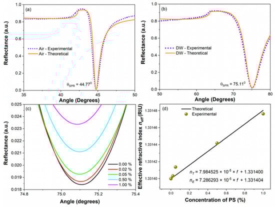(a) Fitting of the experimental reflectance of air to the theoretical signal, (b) fitting of the experimental reflectance of distilled water to the theoretical signal, (c) SPR-scattering reflectance signals for different percentages of PS in distilled water, and (d) theoretical calculation and experimental measurement for different concentrations.