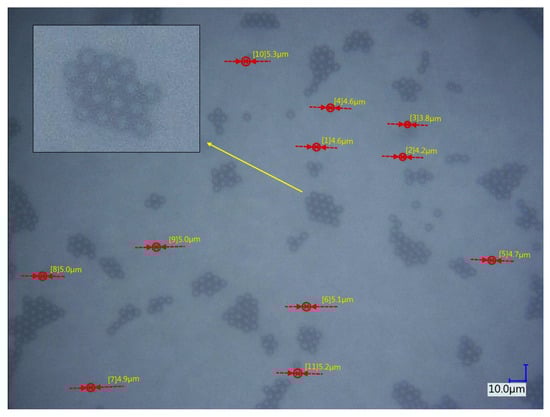 A sample of 5 µm diameter or 2.5 radius SPSP suspension was taken from the manufacturer’s bottle and allowed to dry on a slide for microscopic observation (Figure 5). The diameter measurements (4.6; 4.2; 3.8; 4.6; 4.7; 5.1; 4.9; 5.5; 5.3; and 5.2) yielded an average of 4.76 μm and a standard deviation of 0.45 μm.