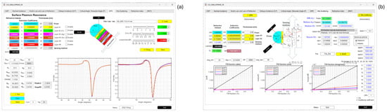 Figure 6 shows two main functions of the application developed in MATLAB for our portable optomechatronic system. The reflectance function with SPR (Figure 6a) is used to simulate a semicircular prism with 1–6 thin films and a dielectric medium at a given wavelength and to fit an experimental signal to a simulated theoretical signal. The reflectance function with Mie scattering (Figure 6b) is used to simulate a semicircular prism with 1–2 thin films and a dielectric medium at a given wavelength and to calculate the effective refractive index (Equation (4) or Equation (5)) using the Mie scattering theory.