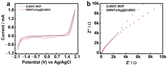 (a) Cyclic voltammogram and (b) electrochemical impedance spectra of ZnBDC and SWNTs/Ag@ZnBDC.