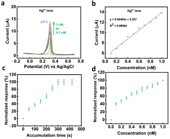 (a) Sensor DPV response toward Hg2+ ions at pH 4 in the 0.1–1 nM range. (b) Calibration plot for Hg2+ ions. (c) Scatter plot showing normalised sensor response (%), with error bars representing ± standard deviation (SD; n = 3). (d) Sensor response at different accumulation times with error bars representing ± SD (n = 3).