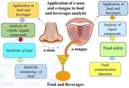 As shown in Figure 1, e-noses and -tongues have shown broad applications in the monitoring of food and beverages, analysis of volatile organic compounds, shelf life in foods, shelf-life monitoring in food, analysis of liquid compounds, food safety and food contamination detection.