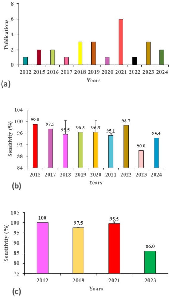 (a) Number of published research articles for both e-nose and tongue during the time period from 2012 to 2024. (b) Performance of e-nose in food monitoring in terms of obtained sensitivity and year-average values for 2018, 2021 and 2024. (c) Performance of e-tongue in food monitoring in terms of obtained sensitivity and year-average values for 2019 and 2021.