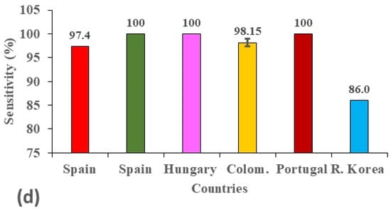 Plotting the data of Table 1, with respect to the performance of countries, it has been confirmed (Figure 5) that in the case of e-nose technology, the best figure, of 26.7%, was obtained by China, while a value of 26.7% for use of e-tongue technology was achieved by Spain. With respect to the sensitivity, a 100% sensitivity was achieved by the UK by using the e-nose system, while in the case of e-tongue, a 100% sensitivity was achieved by Spain, Hungary and Portugal, separately, calculated using various food samples.