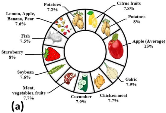 Potatoes are a food product consumed worldwide due to their unique properties, such as their proteins, minerals, and vitamins. Hence, they are widely used for protection from cancer and to strengthen the immune system. To maintain their quality, their storage in houses is one of the most effective and common methods. However, maintaining their sweetness and freshness is a challenging task. Conventional methods, including spectroscopy, acoustics and thermography, are being effectively used to check their quality, but these have the issue of being inefficient, boring, lacking automatic control, and being hard and destructive. Hence, to cover these limitations, Mansour Rasekh et al. [57] forwarded an MOS-based e-nose sensor technology for the detection of sugar and carbohydrate levels, which have a direct relation with shelf life, affecting physiological changes and their susceptibility to spoilage, with over 90.0% accuracy, using quadratic discriminant analysis/multivariate discrimination analysis in potato samples. The VOCs released from various samples detected by the e-nose system were used to categorize both their quality and shelf life. Moreover, decomposed food emits VOCs and undergoes specific chemical transformations, which can be identified and analyzed using advanced sensing technologies [85].