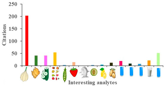In terms of various food samples (Figure 6), a maximum percentage of 15% was obtained by using apple samples with the help of an e-nose while a value of 40.5% was achieved by using water samples through e-tongue technology. By comparing both technologies in terms of the achieved citations, it has been concluded that highest number of citations (203) were achieved by e-nose technology by using garlic samples and a total of 51 citations were reported for e-tongue by monitoring water samples.