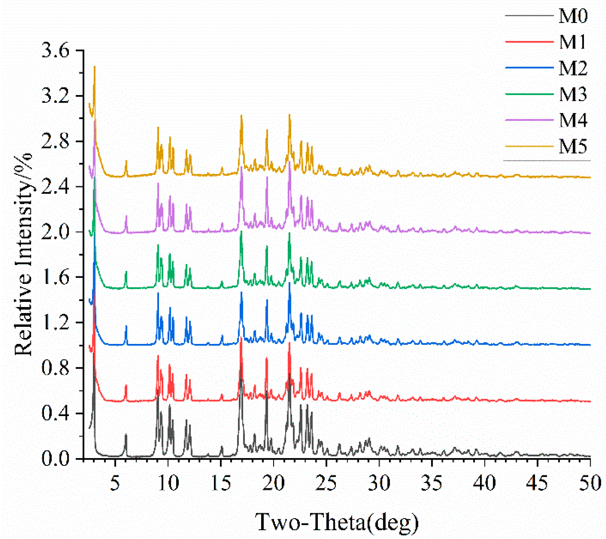 PXRD patterns of mixed samples. PXRD patterns from bottom to top correspond to samples with increasing amorphous content of 0%, 5%, 10%, 15%, 20%, and 30%, respectively.