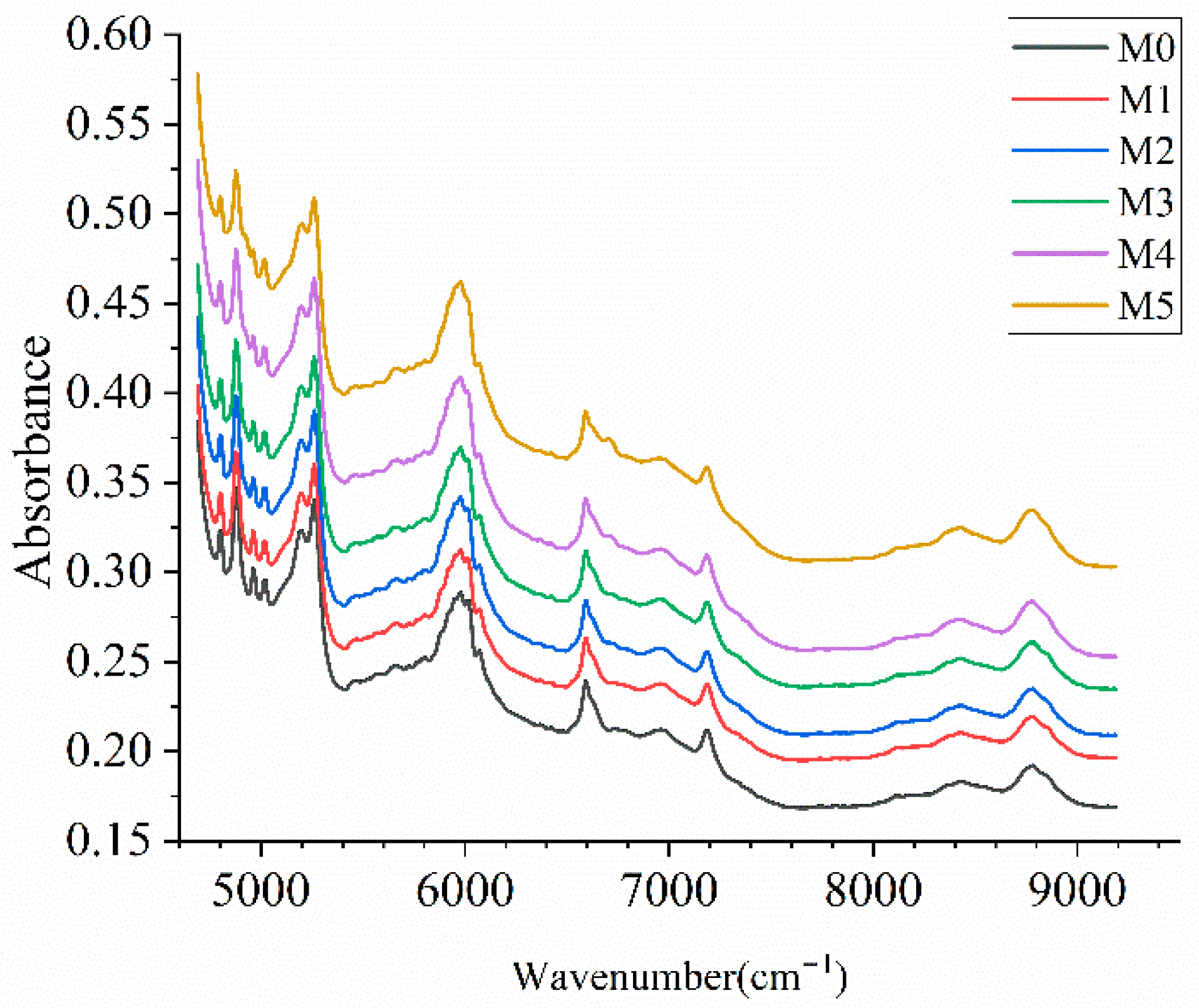 NIRS spectra of mixed samples. NIR spectra from bottom to top correspond to samples with increasing amorphous content of 0%, 5%, 10%, 15%, 20%, and 30%, respectively.