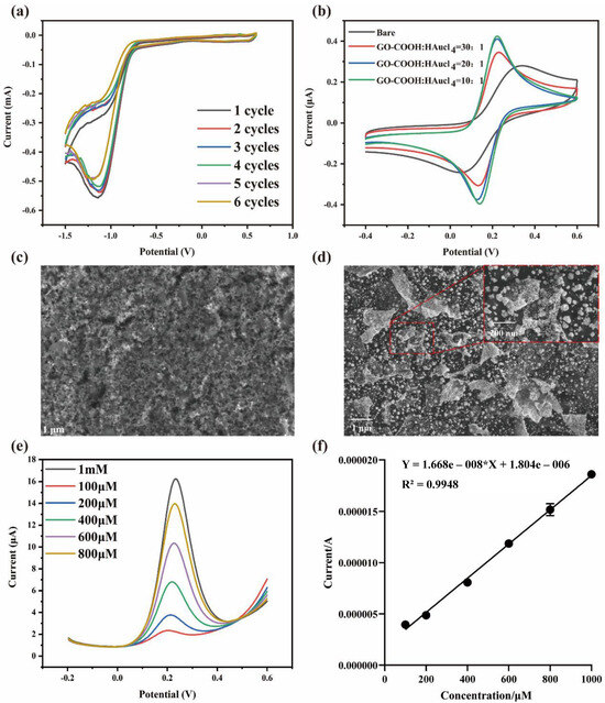 Gold nanoparticles were chosen for signal amplification due to their high specific surface area. In the electrocatalytic process, gold nanoparticles were deposited on the WE through a reduction–oxidation reaction between partially reduced graphene oxide carboxylate and HAuCl4. A commonly cited ratio in the literature is 10:1 for GO-COOH to HAuCl4 [46]. However, to ensure an adequate number of active sites on the graphene oxide surface to support the gold nanoparticles without causing aggregation, an appropriate increase in GO-COOH may be necessary. The proportional parameters of electrode modification were optimized to achieve the optimal results. The impact of different volume ratios of GO-COOH and HAuCl4 on the electrochemical response of the modified electrodes was investigated using volume ratios of 10:1, 20:1, and 30:1 (Figure S4). GO-COOH and HAuCl4 were added dropwise simultaneously to the WE and tested by CV. Due to oxygen-containing functional groups in GO-COOH, GO-COOH adsorbed on the electrode surface was gradually reduced to rGO-COOH [46]. Then, rGO-COOH will reduce AuNPs from the mixed GO-COOH/HAuCl4 solution. Figure 2a shows the reduction of Au3+ to Au0 in the mixture, and the reduction peaks indicate the successful reduction in AuNPs. After completing the modification, the electrode was cleaned and dried. Then, the performance of the modified electrode was tested by dropping a couple of ferricyanide/ferrocyanide solutions onto the working electrode.