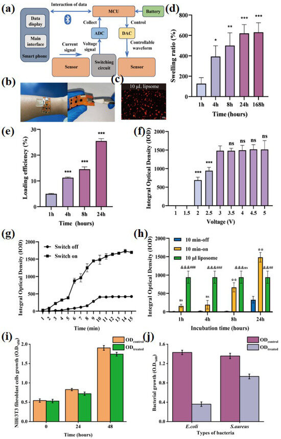 Electronic control Gel-Lipo@Ami drug release test. (a) FPCB circuit flow chart. (b) Integrated system diagram. (c) Image of Lipo@Ami labeled with Rhodamine B (10 μL) under a positive fluorescence microscope. (d) Swelling rate of the Gel. (e) Gel drug loading rate at different incubation times. (f) Cumulative drug release of Gel-Lipo@Ami at different voltages. (g) The natural cumulative release of drugs and the cumulative release of drugs under the control of 3 V voltage within 1–15 min. (h) At 3 V voltage, Gel incubated for 1–24 h, and the drug was released on/off for 10 min cumulative drug release (10 μL fluorescent liposomes used as the control). * represents the comparison between 10 min-on and 10 min-off; and & represents the comparison between 10 μL liposomes and 10 min-off; # represents the comparison between 10 μL liposomes and 10 min-on. N = 3. (i) Effects of hydrogel extract on NIH/3T3 fibroblast proliferation measured at OD450 at 24 and 48 h. (j) Inhibitory effects of hydrogel extract on E. coli and S. aureus proliferation measured at OD600 within 24 h. (*, &, # represent p < 0.05, **, &&, ## represent p < 0.01, ***, &&&, ### represent p < 0.001, ns represents not significant).