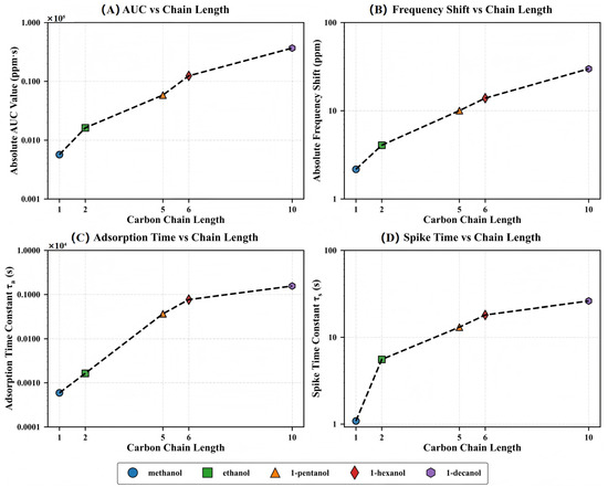 After clarifying the role of molecular dimensions in regulating the adsorption kinetic process, we introduce the carbon chain length as a unifying dimension and examine its relationship with several sensing response parameters. As shown in Figure 7, the four key indices, including the integrated response amplitude (AUC), normalized frequency shift (), adsorption time constant (), and spike decay time constant (), show a consistent and systematic growth trend with increasing carbon chain length, indicating that this MOF–QCM system shows clear structural sensitivity in the molecular recognition process.